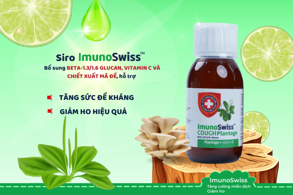 ImunoSwiss từ Thụy Sĩ chứa Beta 1,3/1,6 glucan, Vitamin C giúp tăng cường miễn dịch cho trẻ. Đặc biệt bổ sung thêm chiết xuất MÃ ĐỀ đã được tinh chế loại bỏ tạp chất, giúp giảm ho, tiêu đờm. An toàn cho trẻ nhỏ sử dụng.
