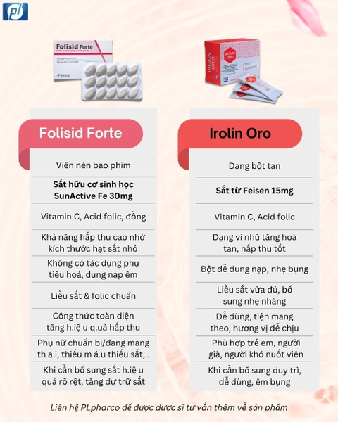 Cả hai sản phẩm Folisid Forte và Irolin Oro của PLpharco đều sử dụng sắt sinh học dạng dễ hấp thu, kết hợp với vitamin C để tăng hiệu quả hấp thụ.